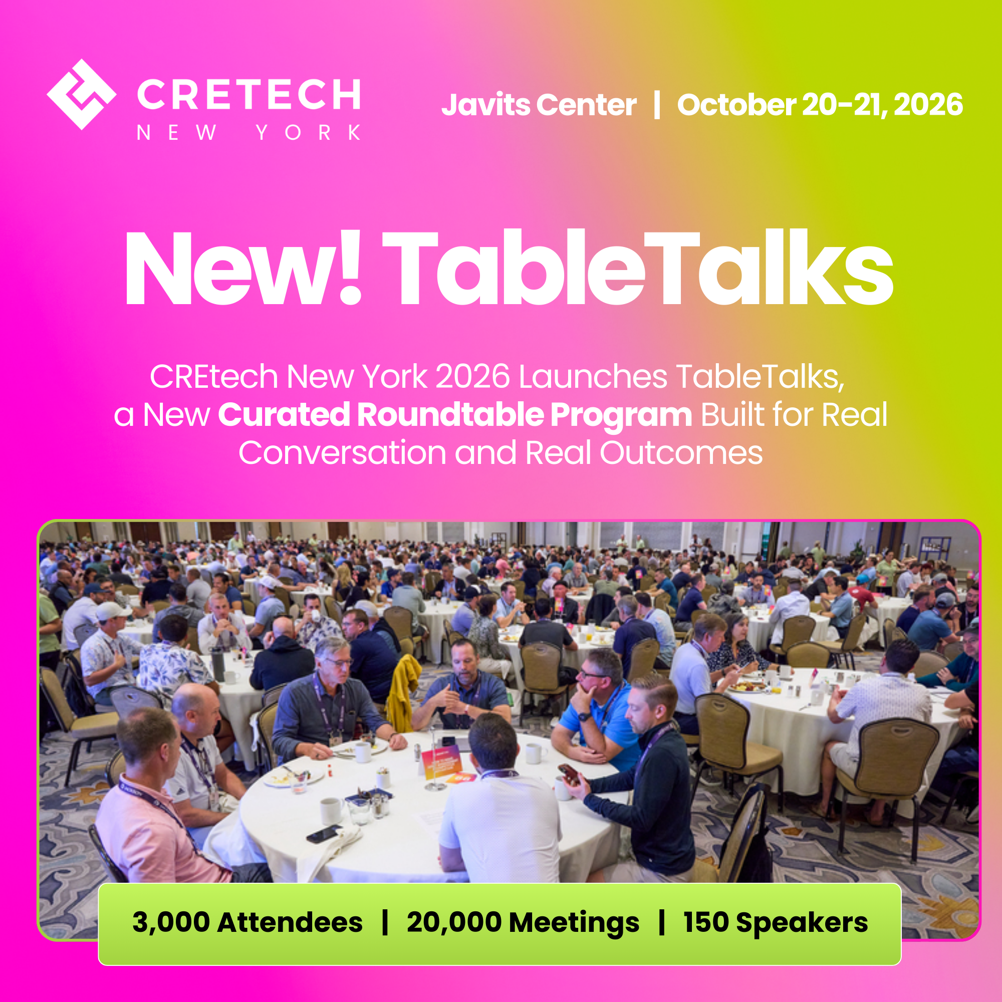 CREtech New York 2026 Launches TableTalks, a New Curated Roundtable Program Built for Real Conversation and Real Outcomes January 26, 2026 Read more